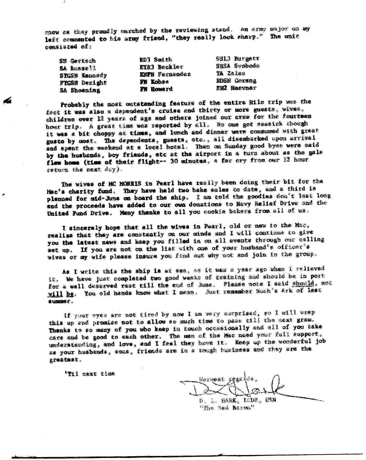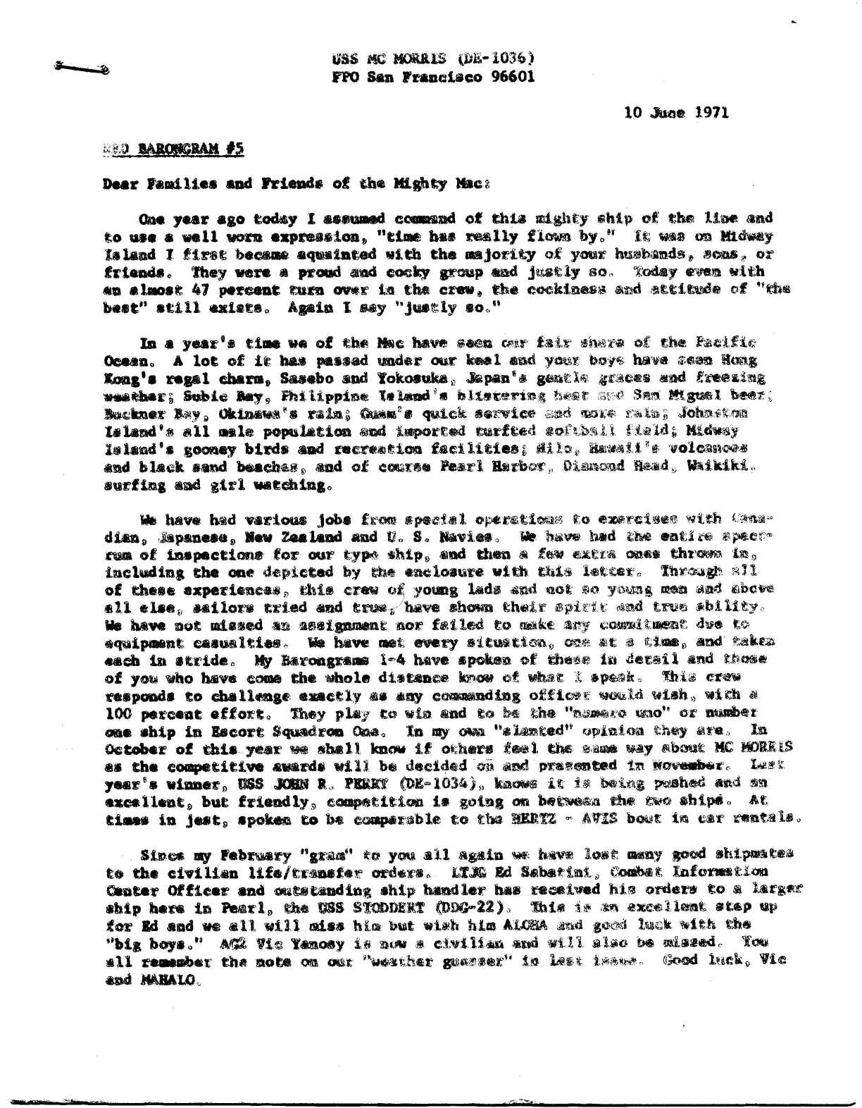 Copy of Red Baron Gram #5 from LCDR Hark, CO of